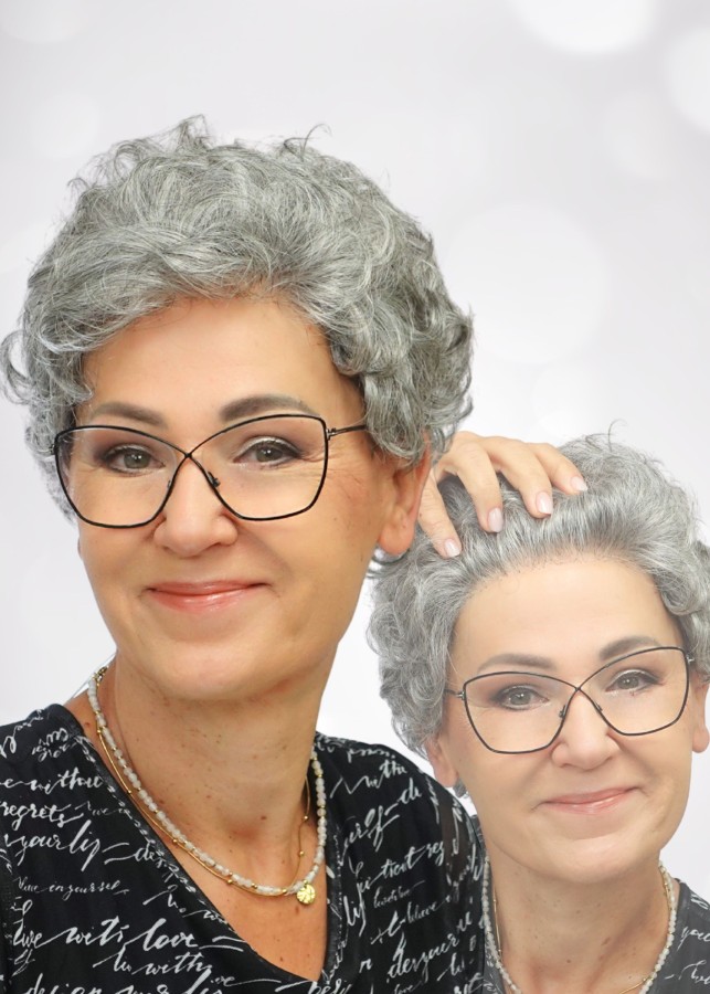 - wrażenie, że na linii czoła włosy wyrastają z prawdziwej skóry głowy