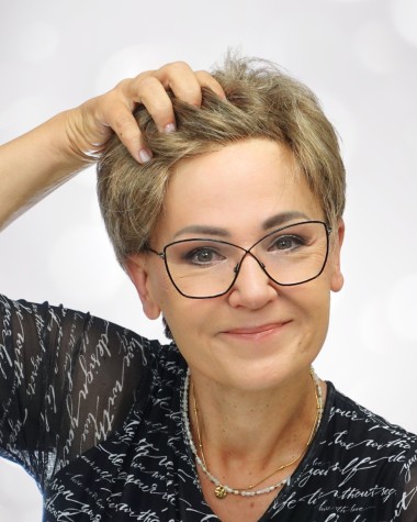 - wrażenie, że na linii czoła włosy wyrastają z prawdziwej skóry głowy